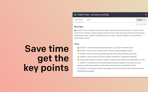 , ChatGPT Suite. This AI-powered extension is designed to help you summarize web pages and YouTube videos effortlessly, making it an ideal
